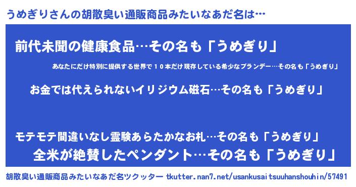 | 男性向けラノベタイトル風あだ名 | 『ノーゲーム・ノーウメギリ』 |