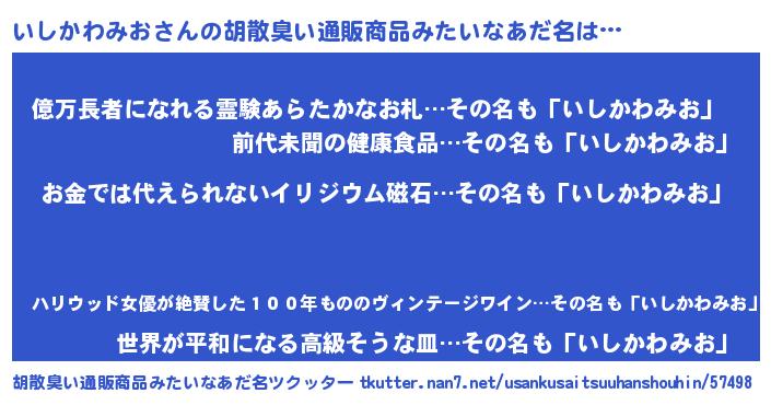 | ヘコむあだ名 | 『いしにゅー』『つくし』『いし太郎』 |