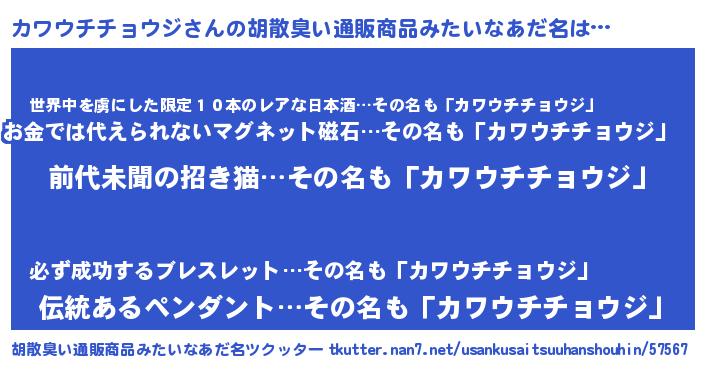 | 意味不明あだ名 | 『永久保存カワウチチョウジ』 |