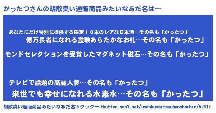 | 男性向けラノベタイトル風あだ名 | 『かったつに滅ぼされるだけの簡単なお仕事です』 |