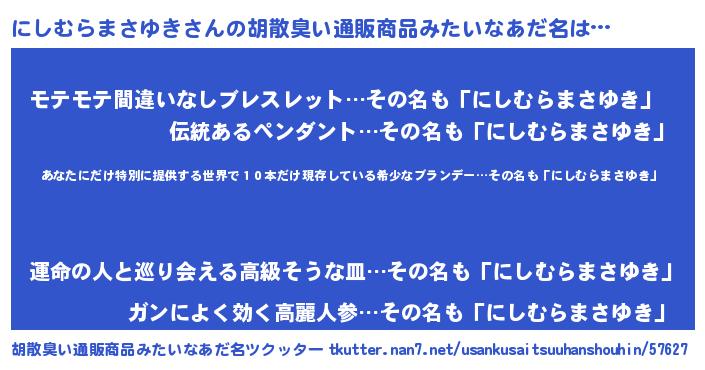 | 意味不明あだ名 | 『住所不定無職にしむらまさゆき(81歳)』 |
