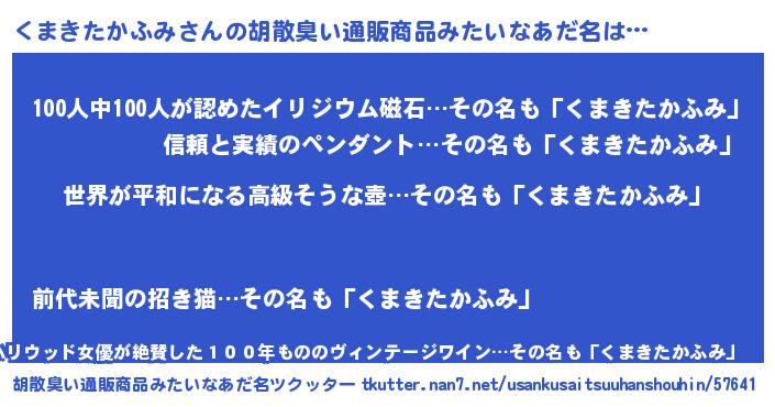 | 男性向けラノベタイトル風あだ名 | 『やはりくまきたかふみの青春ラブコメはまちがっている 』 |