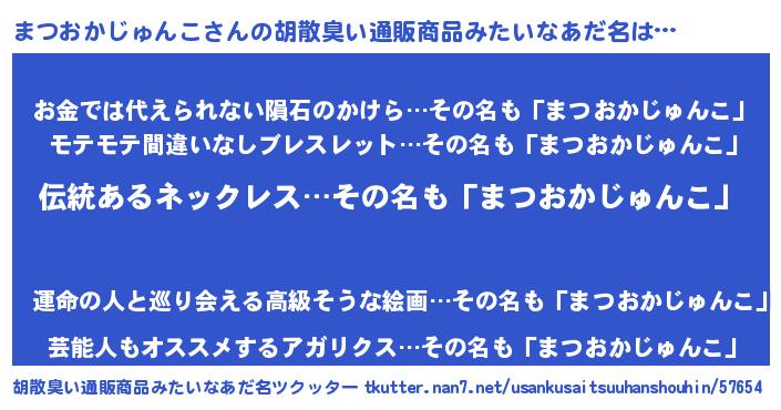 | 男性向けラノベタイトル風あだ名 | 『まつおかじゅんこの嫁は女の子じゃないと思った?』 |