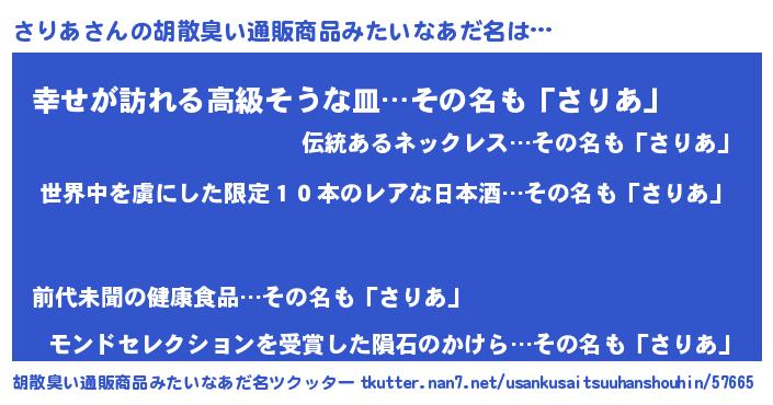| 意味不明あだ名 | 『住所不定無職さりあ(50歳)』 |