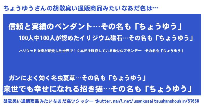 | 意味不明あだ名 | 『住所不定無職ちょうゆう(77歳)』 |