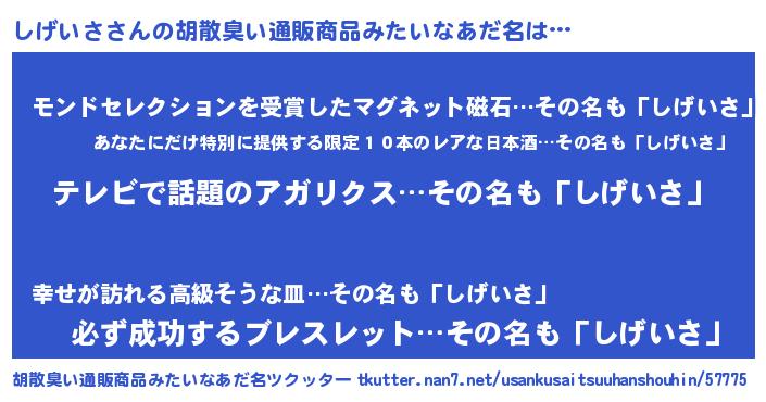 | ヘコむあだ名 | 『しげにゅー』『レバニラ』『しげお』 |