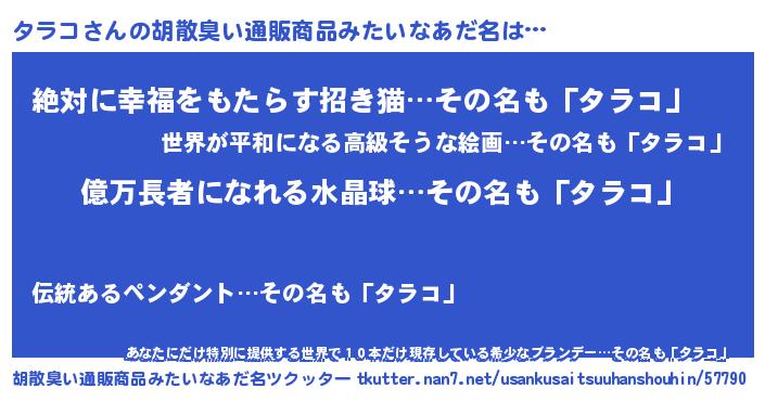 | 男性向けラノベタイトル風あだ名 | 『タラコアートオンライン』 |