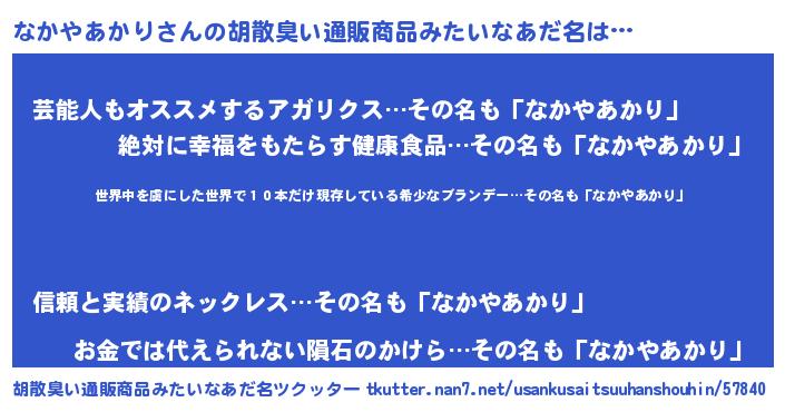 | 意味不明あだ名 | 『住所不定無職なかやあかり(81歳)』 |