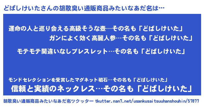 | ヒーロー風カッコイイあだ名 | 『スーパードバシケイタ』『幻影騎士ドバ』 |