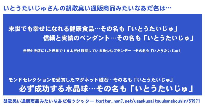 | 意味不明あだ名 | 『住所不定無職いとうたいじゅ(89歳)』 |