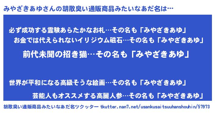 | ヘコむあだ名 | 『みやざきあゆ(笑)』『みやっふぃ~』 |