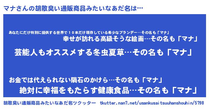 | 意味不明あだ名 | 『自称マナ』『住所不定無職マナ(1歳)』 |