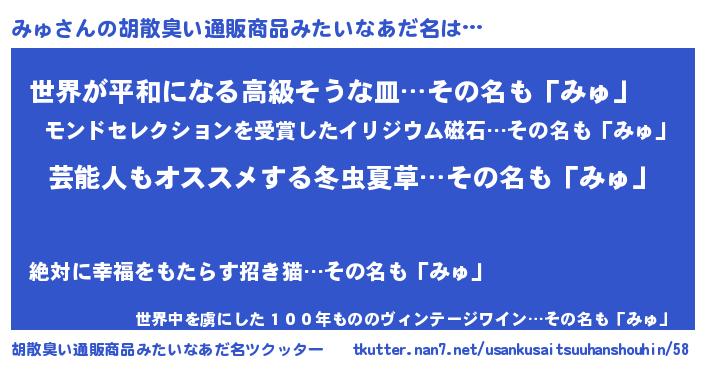| 男性向けラノベタイトル風あだ名 | 『Re:みゅから始める異世界生活』 |