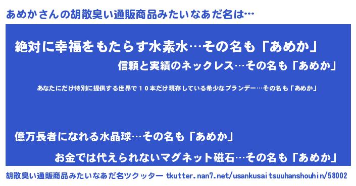 | 意味不明あだ名 | 『住所不定無職あめか(74歳)』 |
