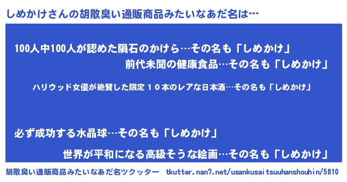 | 男性向けラノベタイトル風あだ名 | 『魔弾の王としめかけ』 |