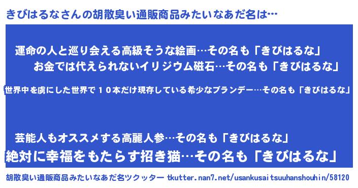 | 意味不明あだ名 | 『住所不定無職きびはるな(93歳)』 |