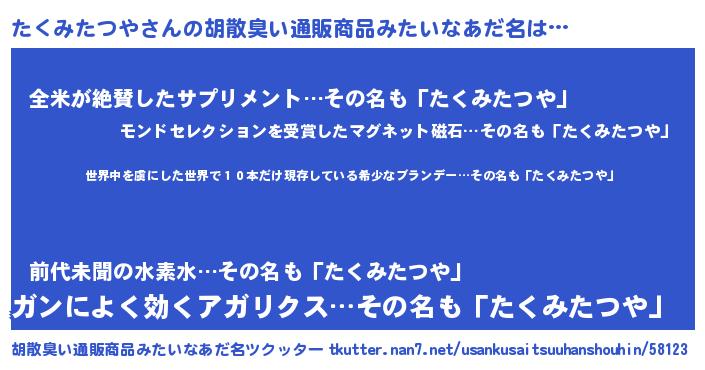 | 意味不明あだ名 | 『住所不定無職たくみたつや(71歳)』 |