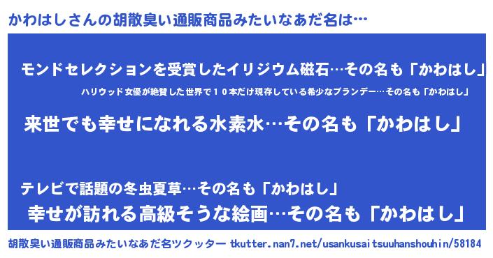 | 男性向けラノベタイトル風あだ名 | 『かわはしという概念が存在しない退屈な世界 』 |