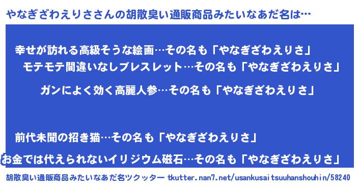 | 女子向けラノベタイトル風あだ名 | 『やなぎざわえりさなんてお断りですっ。』 |
