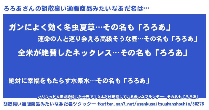 | ヘコむあだ名 | 『ろろ太郎』『つくし』『ろろにゅー』 |