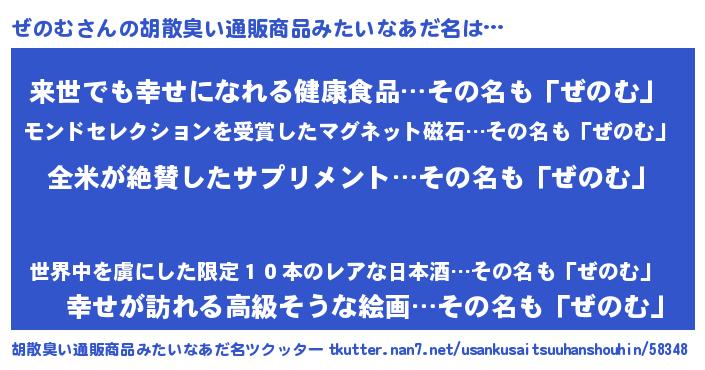 | 男性向けラノベタイトル風あだ名 | 『ぜのむに滅ぼされるだけの簡単なお仕事です』 |