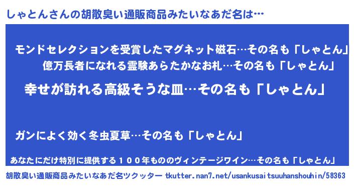 | 男性向けラノベタイトル風あだ名 | 『やはりしゃとんの青春ラブコメはまちがっている 』 |