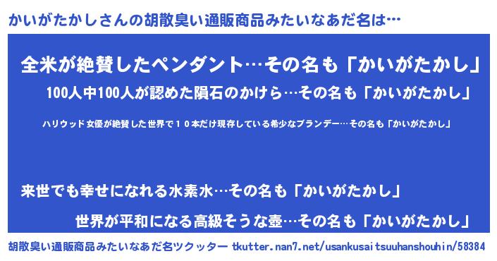 | 意味不明あだ名 | 『住所不定無職かいがたかし(98歳)』 |