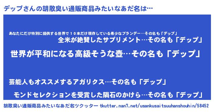 | 男性向けラノベタイトル風あだ名 | 『やはりデップの青春ラブコメはまちがっている 』 |