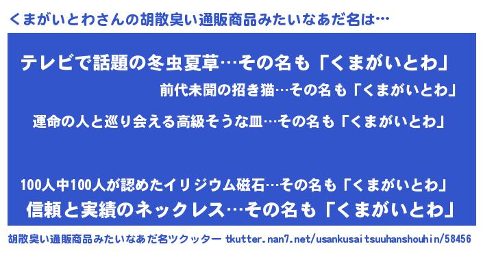 | 男性向けラノベタイトル風あだ名 | 『くまがいとわ~年齢イコール彼女いない歴の魔法使い~』 |