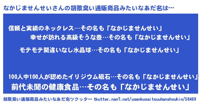 | 男性向けラノベタイトル風あだ名 | 『ナカジマセンセイアートオンライン』 |