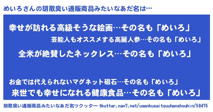| ヘコむあだ名 | 『めいっぺ』『牛乳』『めいろ(笑)』 |