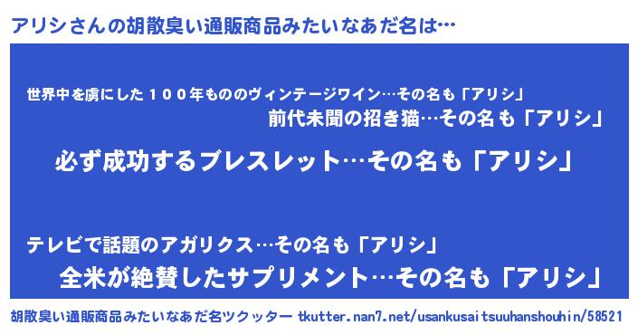 | 意味不明あだ名 | 『ペロリンアリシ』『永久保存アリシ』 |