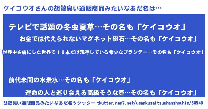 | 意味不明あだ名 | 『住所不定無職ケイコウオ(93歳)』 |