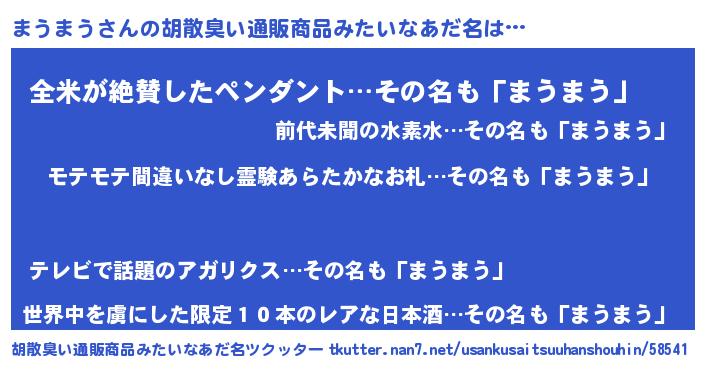 | 男性向けラノベタイトル風あだ名 | 『まうまうの憂鬱』『魔弾の王とまうまう』 |