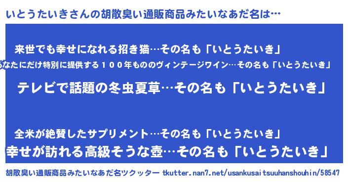 | ヘコむあだ名 | 『いとうたいき(震え声)』『豆乳』 |