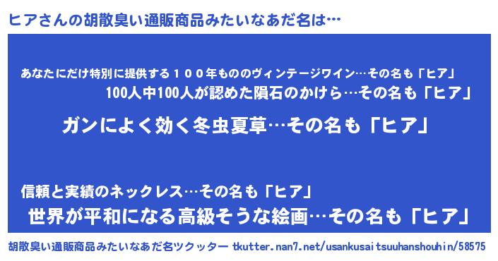 | 女子向けラノベタイトル風あだ名 | 『ヒアなんてお断りですっ。』 |