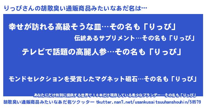 | 男性向けラノベタイトル風あだ名 | 『Re:りっぴから始める異世界生活』 |