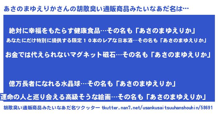 ヘコむあだ名 | 『あさのまゆえりか(笑)』『牛乳』 |