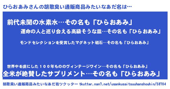 | ヘコむあだ名 | 『ひらおあみ(笑)』『ひらっちょ』 |