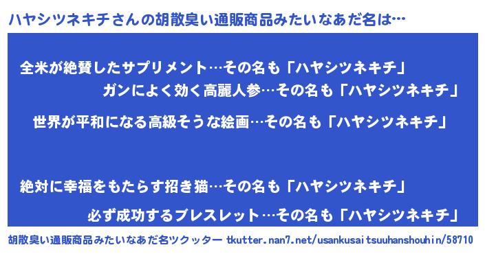 | ヘコむあだ名 | 『豆乳』『ハヤお』『ハヤもー』 |
