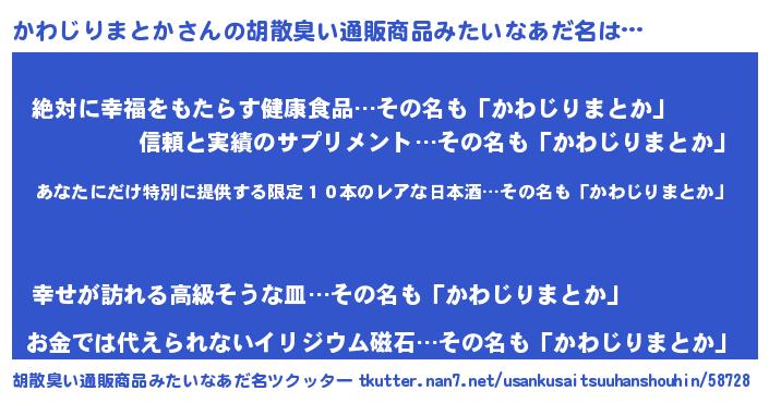 | 意味不明あだ名 | 『住所不定無職かわじりまとか(59歳)』 |