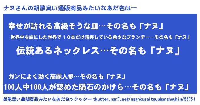 | 意味不明あだ名 | 『とにかく怪しいナヌ』『自称ナヌ』 |
