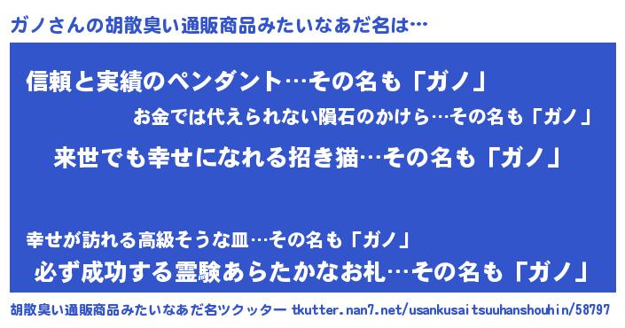 | 男性向けラノベタイトル風あだ名 | 『転生したらガノだった件』『緋弾のガノ』 |