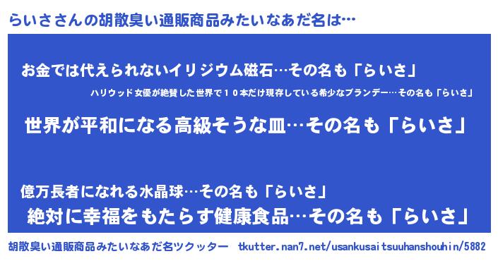 | 意味不明あだ名 | 『なめこ科らいさ属』『永久保存らいさ』 |