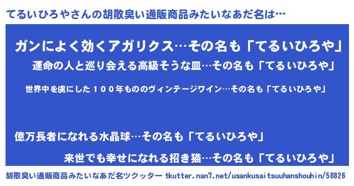 | ヘコむあだ名 | 『てるいひろや(小並感)』『つくし』 |