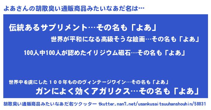 | 意味不明あだ名 | 『眠気覚ましガムよあ味』『自称よあ』 |