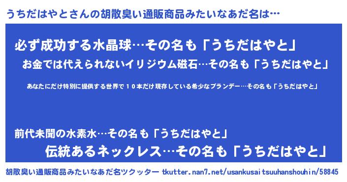 | 意味不明あだ名 | 『住所不定無職うちだはやと(91歳)』 |
