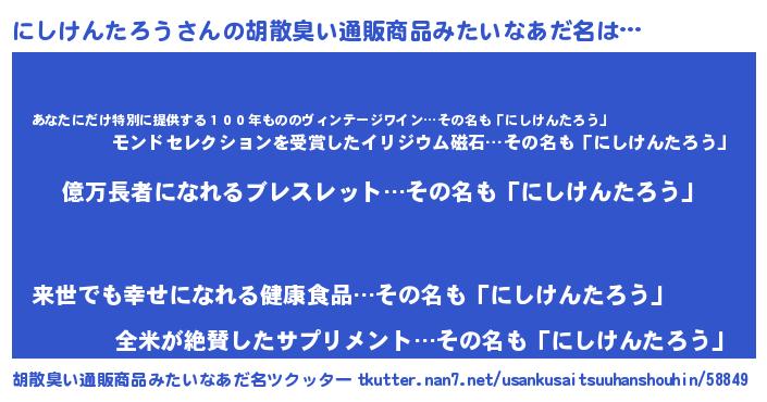 | 男性向けラノベタイトル風あだ名 | 『にしけんたろう~年齢イコール彼女いない歴の魔法使い~』 |
