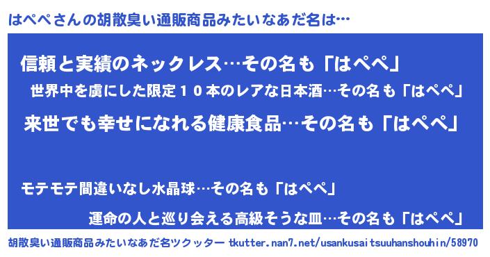 | 欧米人風あだ名 | 『ダルビッシュはぺぺ』『ウサインはぺぺ』 |