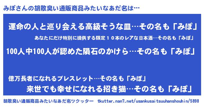 | 男性向けラノベタイトル風あだ名 | 『ミポスレイヤー』『はたらくみぽさま!』 |